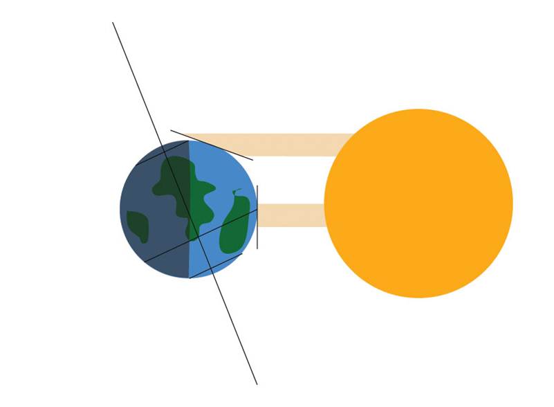 Når solen vandrer sydpå i vinterhalvåret, bliver det koldt mod nord. Længst mod nord kommer solen slet ikke op over horisonten, og disse områder taber varme til universet hele den periode, hvor solen udebliver. Jo længere mod syd vi kommer på den nordlige halvkugle om vinteren, jo mere sol kommer der ind til jordens overflade, og jo større er den vinkel, hvormed solens stråler rammer jorden.